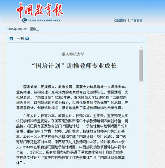 9月9日,《中国教育报》以《“国培计划”助推教师专业成长》为题,对学校积极扎实推进国培计划培训工作进行了报道。报道指出,学校坚持“以高效国培为导向,以创新培训方式为核心,以强化质量监控为保障”的思路,完善顶层设计、创新培训模式,很好地起到了实施教师培训的示范作用。2014年我校承担的国培项目类别在教育部组织的匿名评估中获得1个全国第一,1个全国第二,3个全市第一,1个全市第二,所有项目类别均获得了满意度排名前十的优异成绩。今后,学校还将进一步主动走出去,了解区县尤其是乡村基础教育现状,设计更适合当地需要的培训,使重庆师范大学教师培训走向可持续性发展,塑造具有重师特色的教师培训文化,打造一流的教师培训品牌。